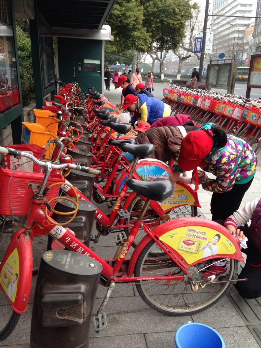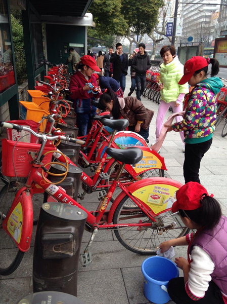 到了那里,小朋友们不由分说地卷起衣袖,捡干净每一个车筐内的垃圾,擦亮每一辆红色公共自行车。