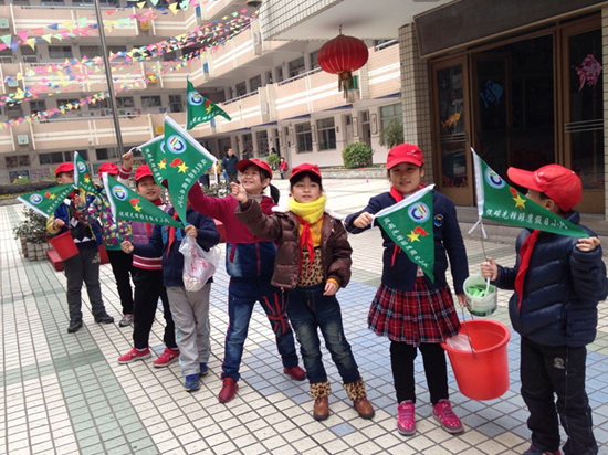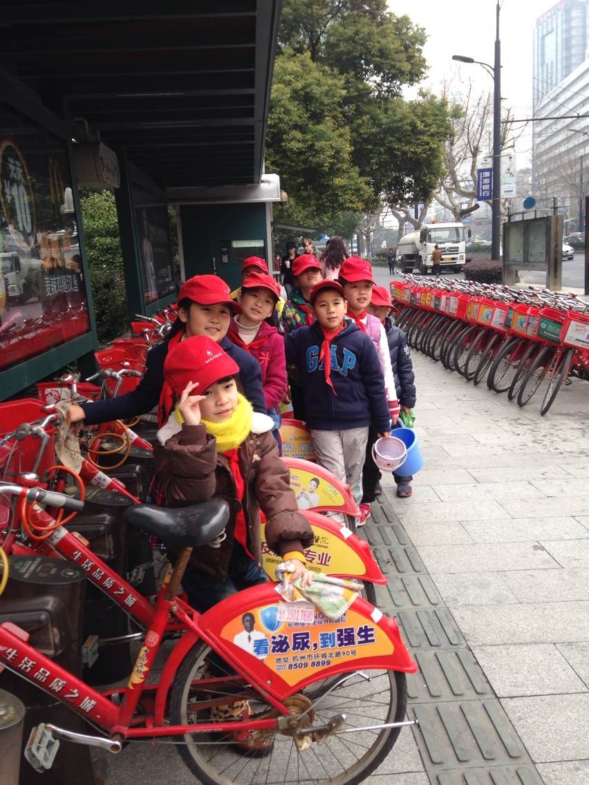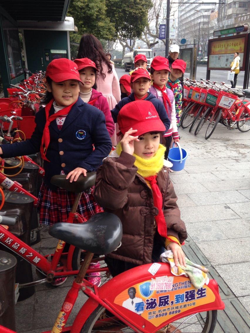 今天是每年一度的学雷锋纪念日,杭州长江实验小学三(3)班的8名少先队员在中队辅导员徐杨娟老师的带领下,满怀激情地开展了“小红帽扮靓小红车志愿者活动”。孩子们拎着小水桶,拿着抹布,面带阳光的笑容,向武林广场南边的公共自行车服务点走去。